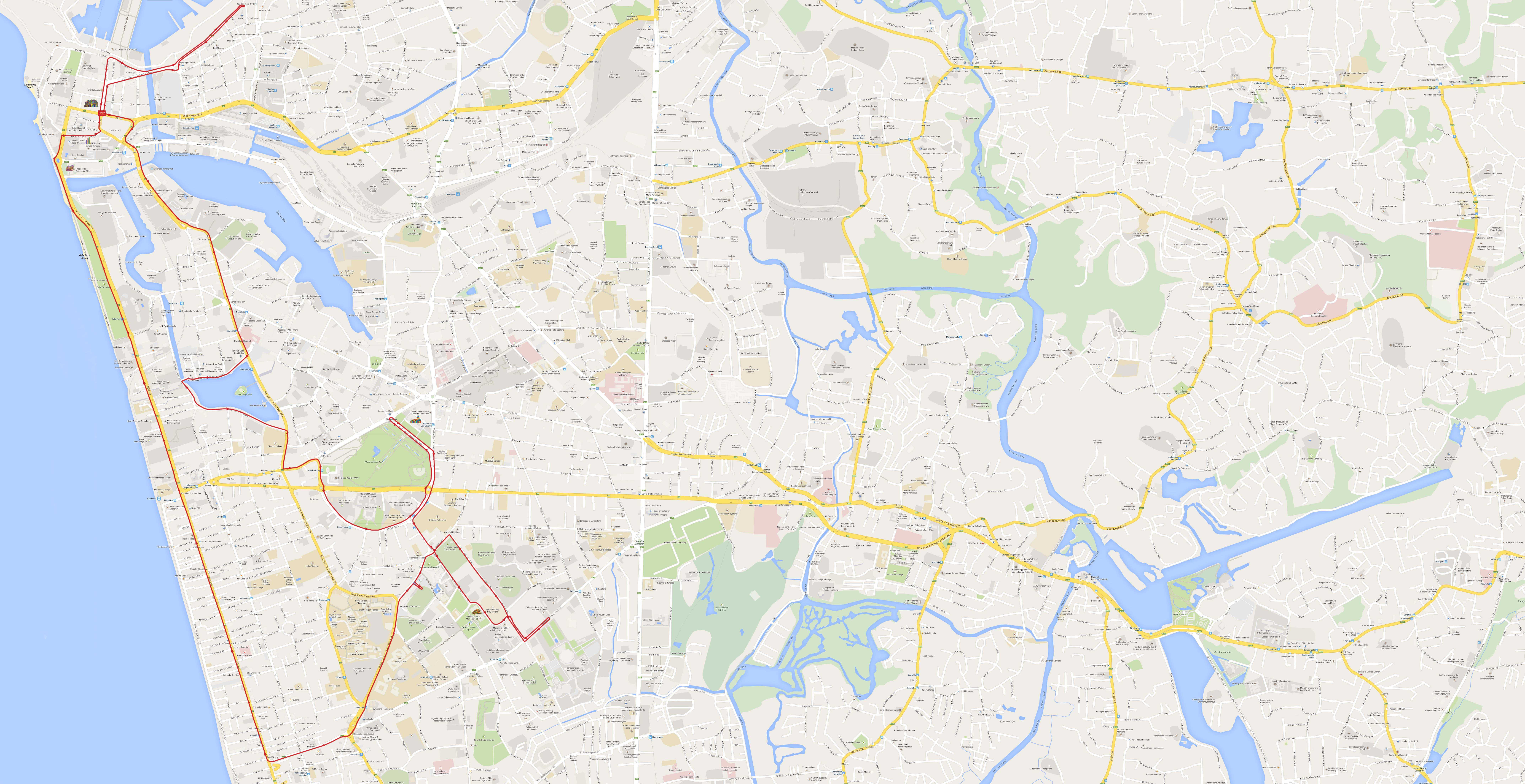 Colombo Lighthouse, The Prison Cell of the last Sri Lankan King, Lighthouse with Clock Tower designed by Lady Ward (built before the Big Ben in London), Galle Face Promenade with cannons of World War II, the Port City, South Expansion of the Colombo Harbour, President’s House, York Street with remnants of British Colonial Architecture, Fort Railway Station, central bus terminal, Floating Market, Slave Island area, Lotus Tower, famous Hindu Kovil with a uniquely carved ‘gopuram’, the scenic Beira Lake in the heart of the city, the War Memorial, Public Library, National Museum, Nelum Pokuna Theatre, Vihara Mahadevi Park, Colombo Town Hall, Independence Square and Arcade Independence Square, Bandaranayake Memorial International Conference Hall , Race Course and many more historical and important landmarks and places that make an interesting tapestry of the life within the city limits of Colombo.